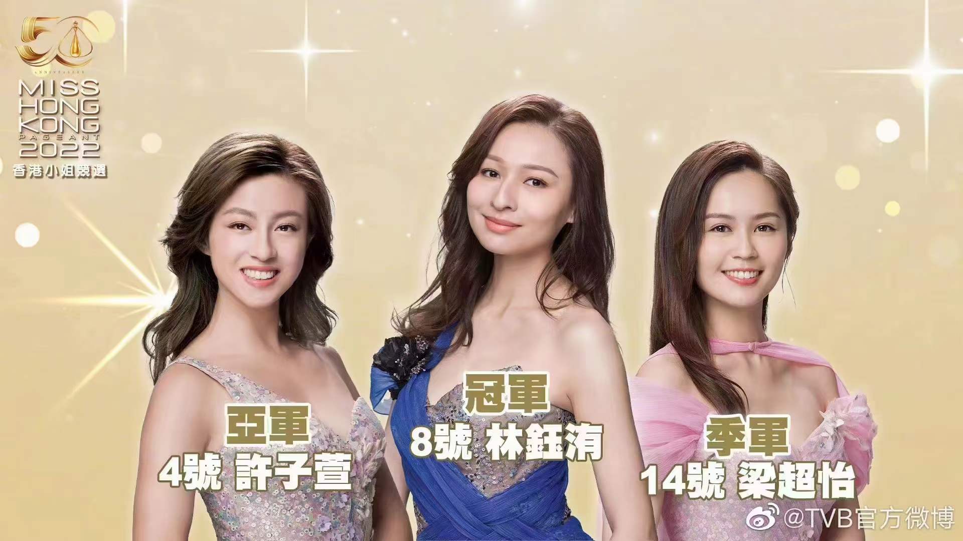 适逢港姐选举50周年,大会选择在红馆重金打造重现港姐50年历年场景的决赛舞台。演出嘉宾由王灏儿、林二汶打头阵,带领穿着华丽晚装的19位佳丽出场。当晚,8号选手林钰洧获得冠军,亚军为4号许子萱,14号梁超怡摘得季军。