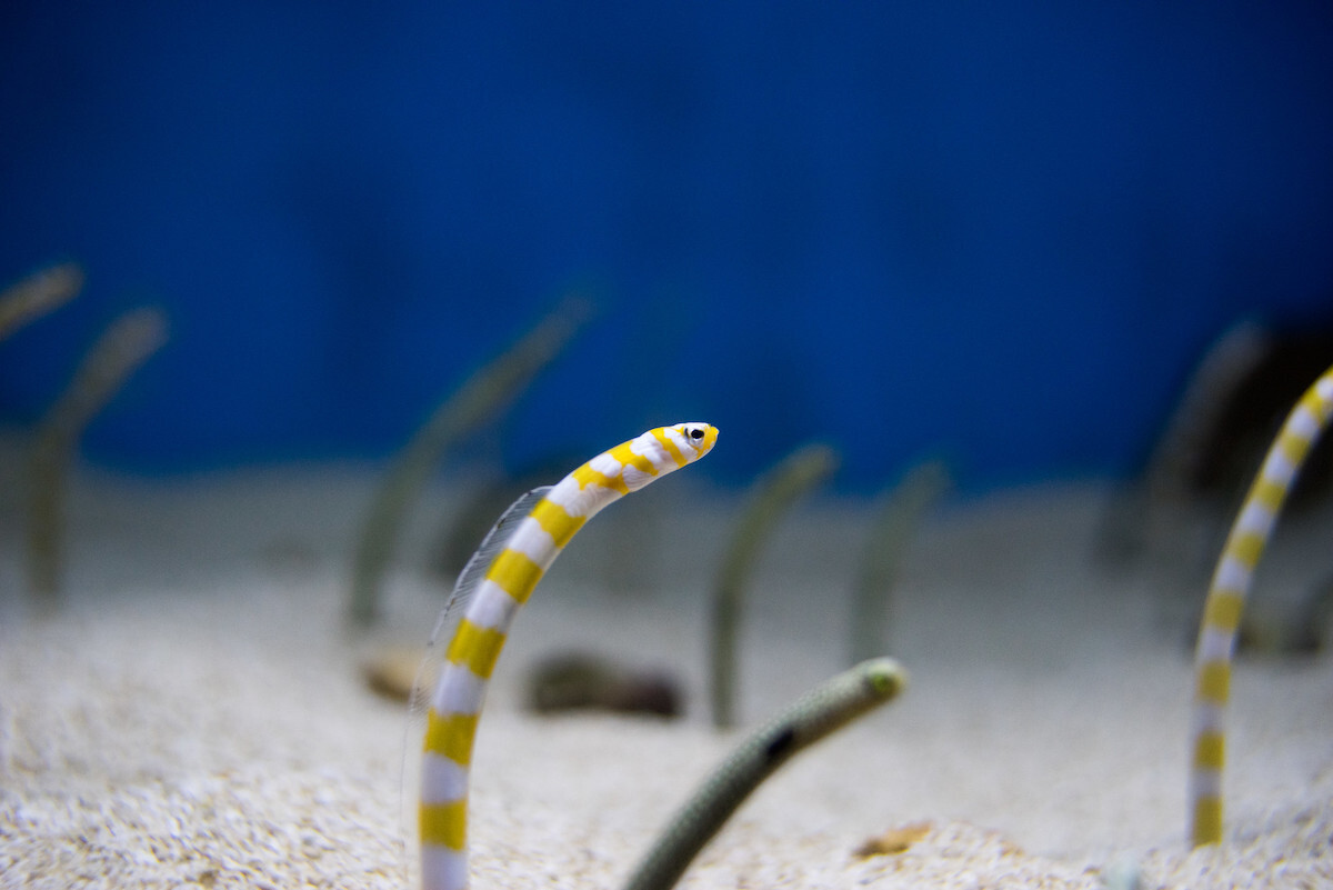 花园鳗是群居动物,这个优雅的物种喜欢成群聚集在一起,它们生性害羞、胆小,可能会在你靠近时,迅速将身体缩回洞穴中。